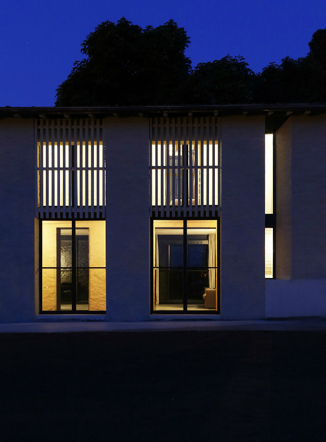 面向公园一侧布置了主要的起居空间,二楼上新扩建的部分安排了卧室。厚厚墙面使得窗洞进深较深,沿内墙放置的窗户从视觉上似乎消失了,仿佛只有窗洞的建筑获得了纯粹的永恒感。