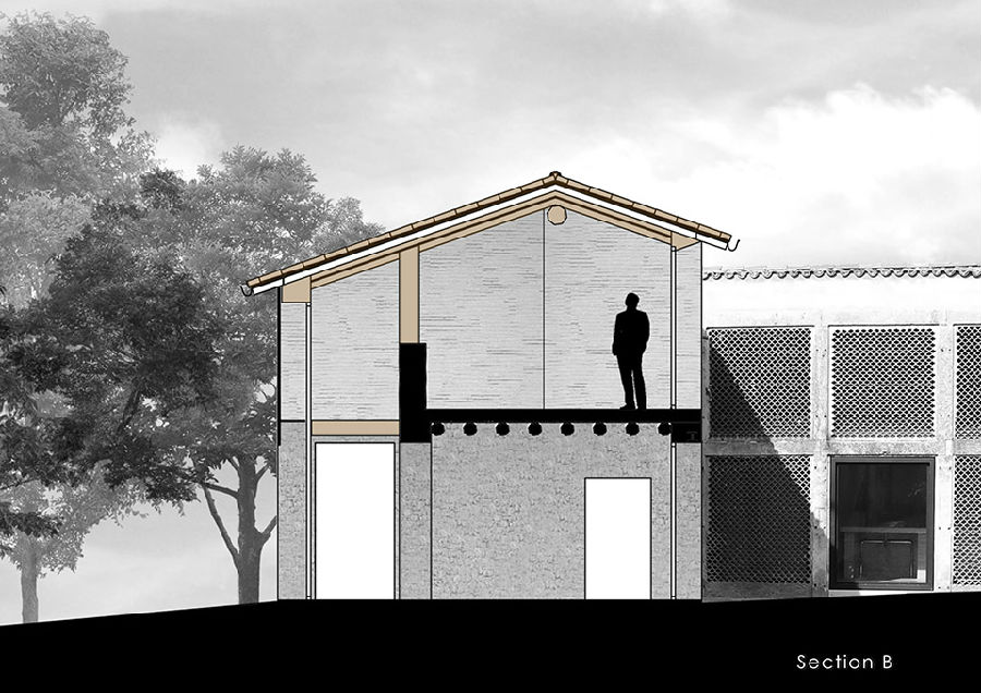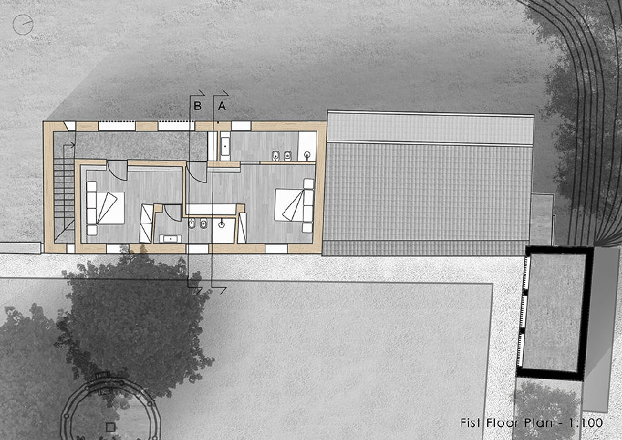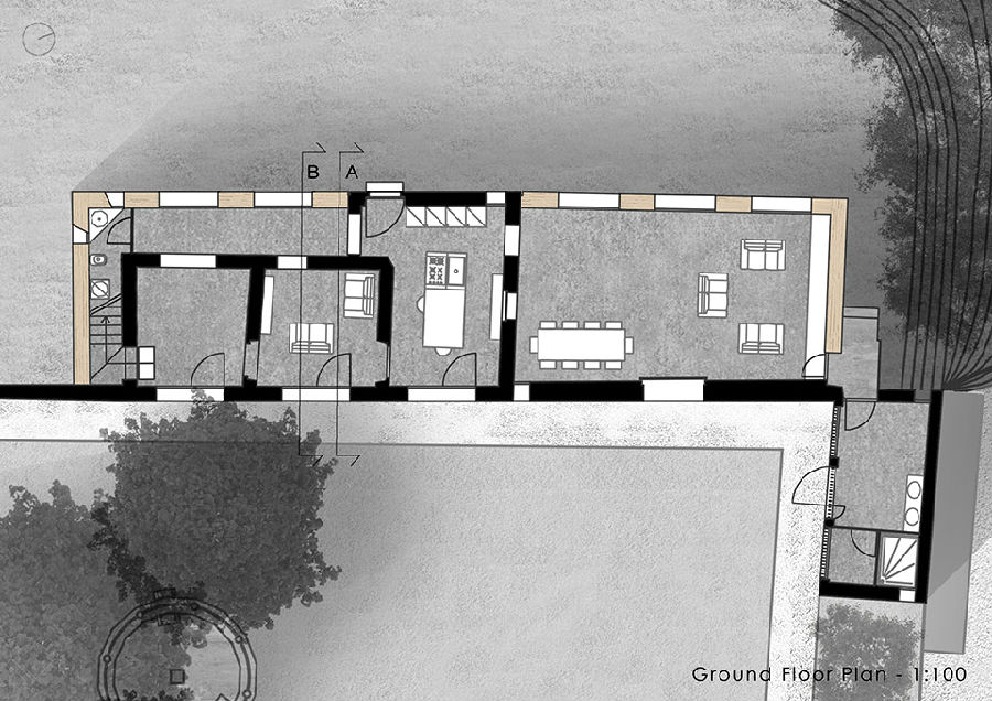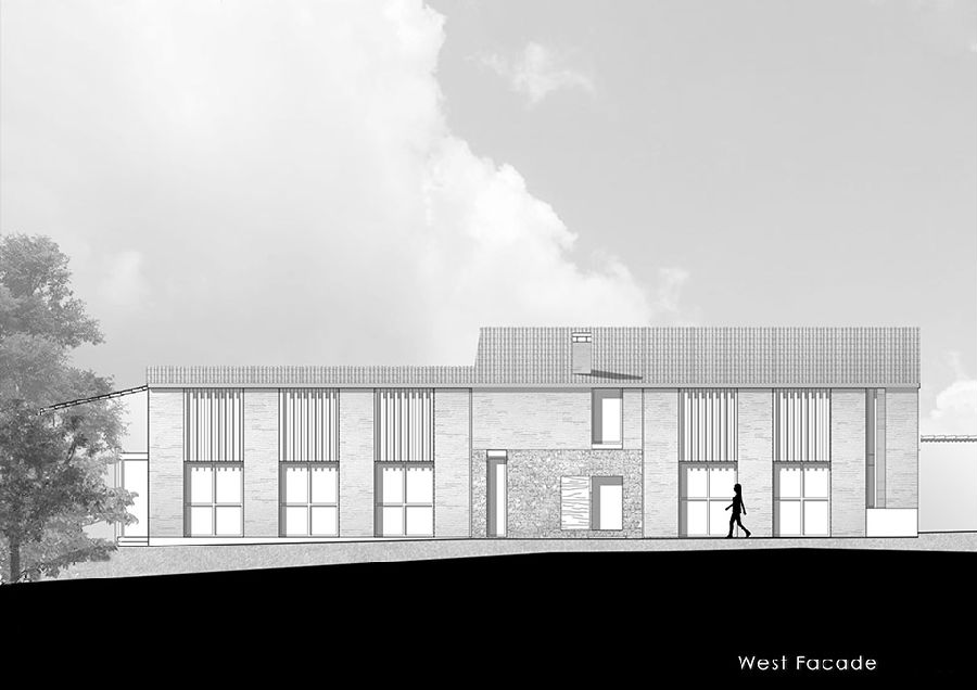 别墅位于当地有名的大公园中,过去一次扩建曾不适宜的在原有石材墙面基础上浇上混凝土,与自然风貌不符。在这次改建中,建筑师面对风景如画的景观决定恢复建筑原本的质朴,将第一次改建的混凝土拆掉一部分,然后在此基础上砌砖。最终,在建筑的外立面可以看到三层结构:具有历史的石墙,第一次改建留下的混凝土,以及这次改建使用的砖墙。为了统一外立面不同材料不同色彩的强烈对比,建筑师采用生石灰颜料粉刷了整个建筑。这样,建筑不仅与公园和地貌景观和谐,还能清晰的显示出新旧关系。