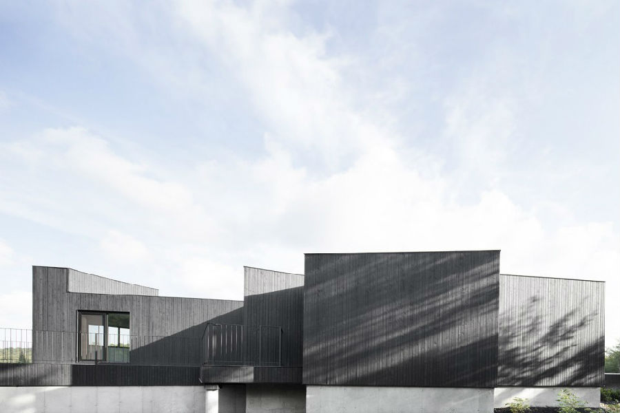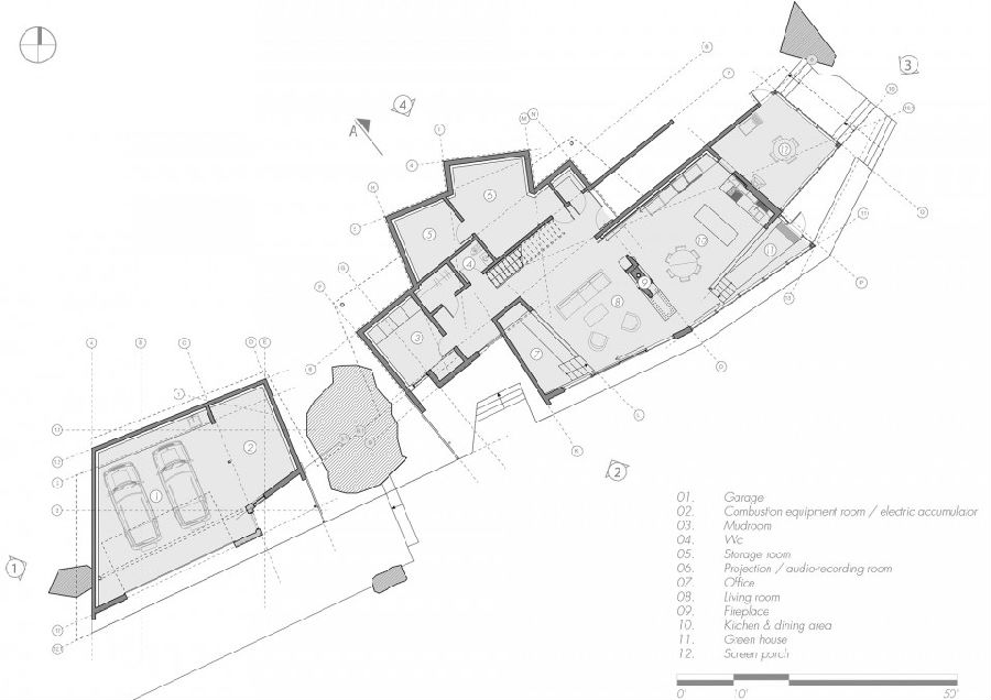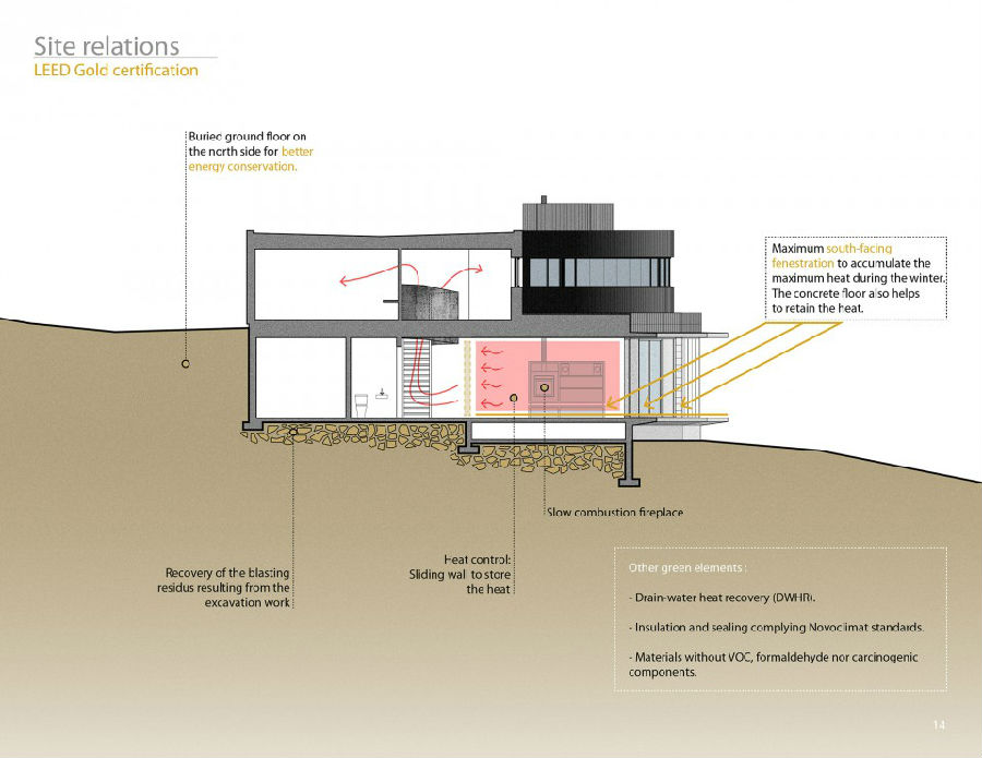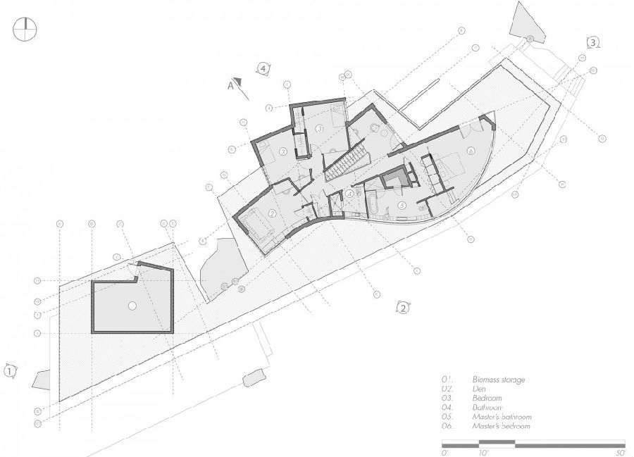 业主是一对有两个孩子的年轻夫妇,希望建造一座符合自身价值观且与周围的自然环境和谐共生的房子。业主在环保方面的要求是不可妥协的:居住空间内不能存在任何磁场,不存在任何无线通讯协议,能源自足,材料不含有挥发性有机化合物,建筑废料可回收利用,使用电动汽车等等……面对诸多的技术性要求,建筑师提出一个更具有建筑学语义的、与“可持续发展”相呼应的概念:场所价值。项目所在的基地是一个陡峭的斜坡,对角线形的平面不利于住宅落在此地。因此建筑师以基地上三块巨石为支点,打造了一个平台,平台下方是起居空间,上方是卧室。
