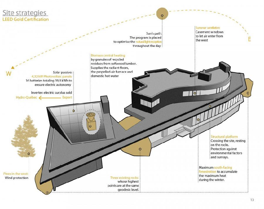 La Héronnière是对“回收”概念的演绎。建筑师通过实践提供了一个案例,展示“可持续性”重要意义。La Héronnière的设计涉及到“升级回收”的理念:基于回收和可再生能源利用技术,将老一套的“回收”理念升级到一个新的愿景层面。该项目的架构由4部分组成:基地,供给,再利用和独特性。它们在建筑师的设计过程中反复出现,对形式和场所的质疑先于任何程式化的问题而存在。
