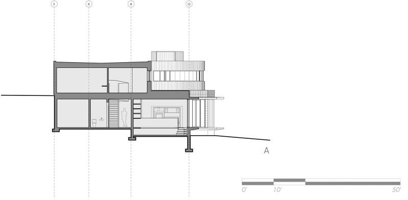 在平台下方,建筑师设计了一个露台用于室外活动。爆破遗留下来的残渣被压实,成为建筑的地面。支撑平台的墙体由混凝土制造而成,墙体与山体紧密相连,保持了原有的地貌。墙体的走向与空间布局的轴线相垂直,且与太阳运行的轨迹有所关联,这是为了尽可能地在特定的时间段获取并储存热量。地面铺装同样使用混凝土,起到储热和传递荷载的作用。